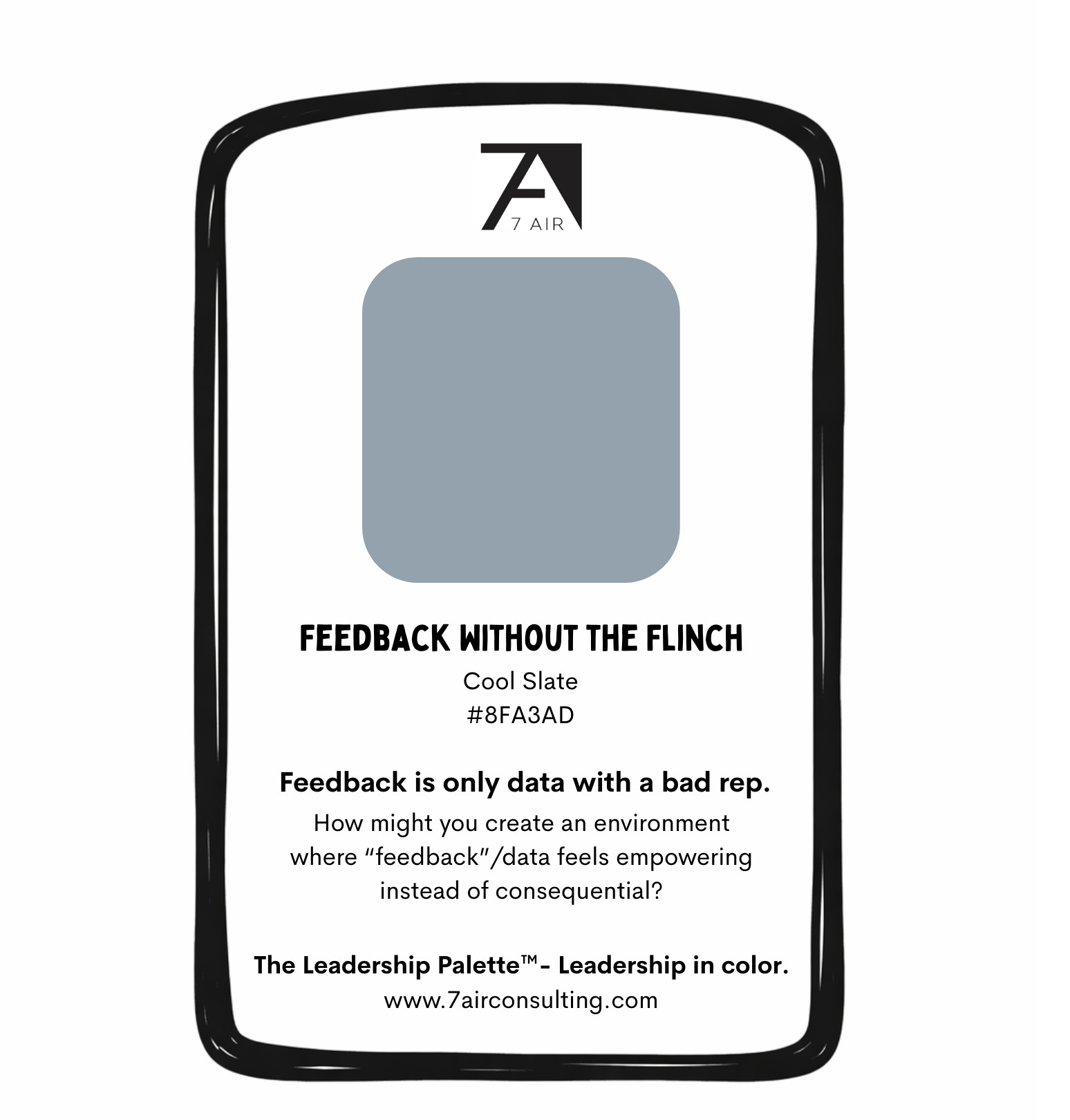 Teams that establish a common language about what “feedback” means always outperform the teams who don’t. Re-establish a common language around feedback by using the word “Data” instead. That’s it. Showing data is clarity, offering information is the “bullseye” for someone to hit every time. It’s empowering, inspiring, a next step in a path of success. The color “Cool Slate” reminds us to stay cool, grounded, calm and intentional with our delivery of the data we intend to share with someone. And, not anticipate someone else's emotional reaction to it.